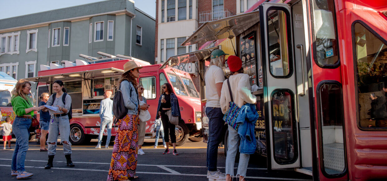 Off the Grid Catering strives to bring you the lively atmosphere of our market experiences. We offer flexible set-up for both indoor and outdoor venues, third party vendor curation and diverse food from the Bay Area’s best food creators. Curbside, inside or outside.